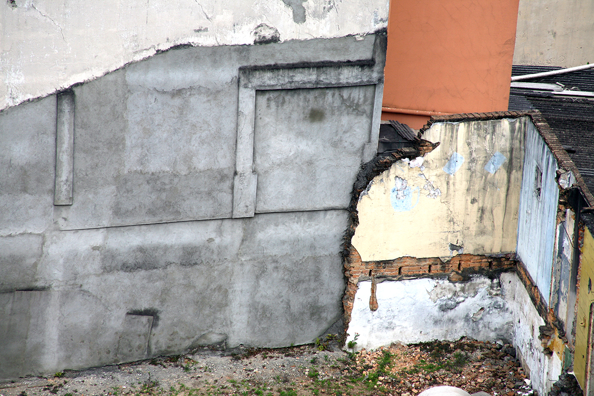 ‘E uma pesquisa em processo iniciada em 2010 onde percorro casas e prédios demolidos na cidade, nos bairros das Perdizes, Pompéia, Campos Elíseos, Higienópolis e Vila Madalena.Com base nessa exploração o trabalho tem referências nos signos urbanos revelando questões sócio- econômicas da cidade, em que o desenvolvimento e o abandono interagem.